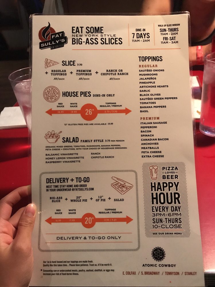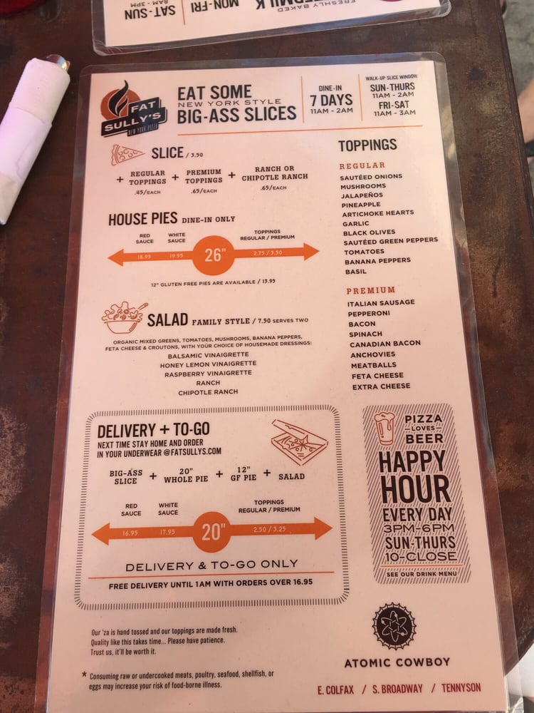Welcome to Fat Sully’s Pizza, a beloved spot in Denver known for their NY-style pizza. Offering delivery, takeout, vegan options, and a full bar, this casual joint is perfect for a night out with friends or a quick bite. Customer reviews rave about the buttery biscuits from Atomic Cowboy, which is part of the same establishment. The pizza slices are thin, crispy, and loaded with fresh toppings like basil, satisfying even the pickiest of eaters. The smashed burger is a must-try, with flavorful beef and cheesy goodness sandwiched between pillowy buns. If you're in the mood for a slice and beer combo, look no further than Fat Sully's. With fast service and a great ambiance, this spot is sure to become your new go-to for delicious pizza in Denver.